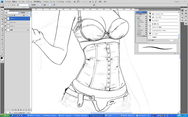 珍しくフォトショップでラフ描いてます。いままでペインターでやってましたが、修正に拡大縮小、回転など切ったり貼ったりなので。ブラシの感触がペインターの方が好みだったのですが良い感じ。気持ち良い。
